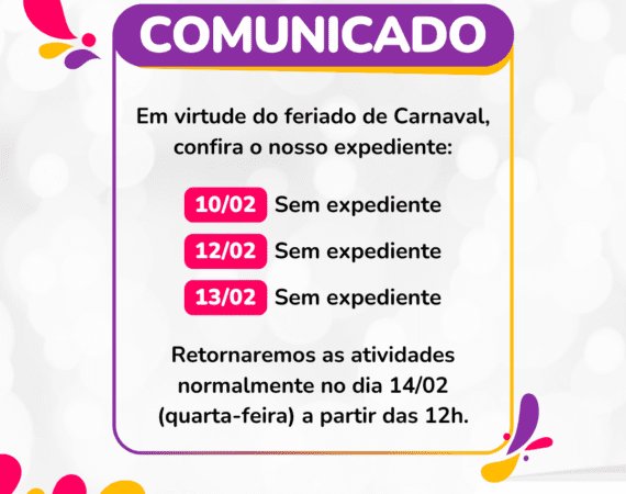 ⚠ Clientes e Shorianos, informamos que estaremos de recesso durante o Carnaval, nos seguintes dias: 10/02 – Carnaval (sábado); 12/02 - Carnaval (segunda-feira); 13/02 -...